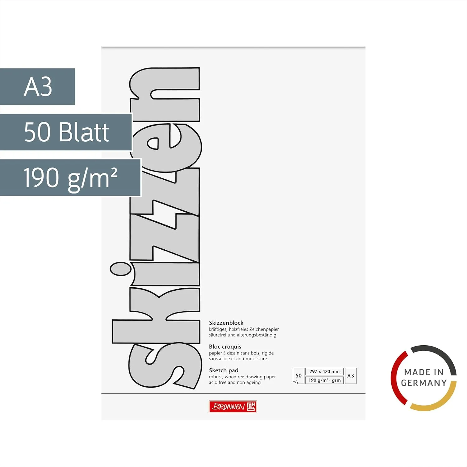 Sketch pad · A3 · Contents: 50 sheets · Strong cardboard envelope, white envelope · Glued · With strong underlay · 190 g/m², offset drawing card · Acid free