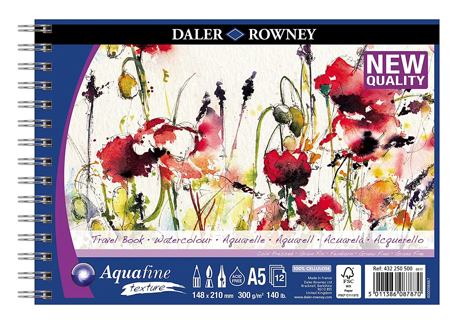 Daler Rowney Aquafine Texture Travel Book A5 Spiral Pad 12 Sheets 300 Gsm Fine Grain Acid Free,