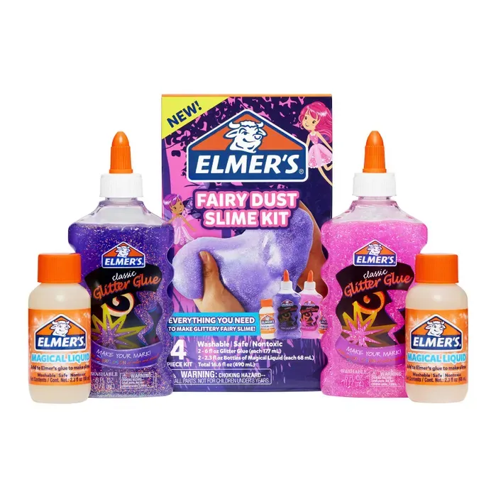 Elmer's delivers everything you need to make glittery, fairy slime with the Fairy Dust Slime Kit! The specially formulated washable glues are safe and non-toxic, making them an ideal choice for children. The kit includes 2 bottles of glitter glue, in pink and purple, and 2 bottles of Magical Liquid Activator that easily transforms your glue into slime. Discover endless creativity with Elmer’s slime products! Features •Hypoallergenic and non-toxic for safe use in the classroom, childcare center, or home •Magical Liquid eliminates the need for contact solution, baking, and other additives so making slime is easy •Playing with slime can strengthen hand and finger dexterity and fine motor skills •Engaging and fun sensory activity •Designed for ages 3 and up