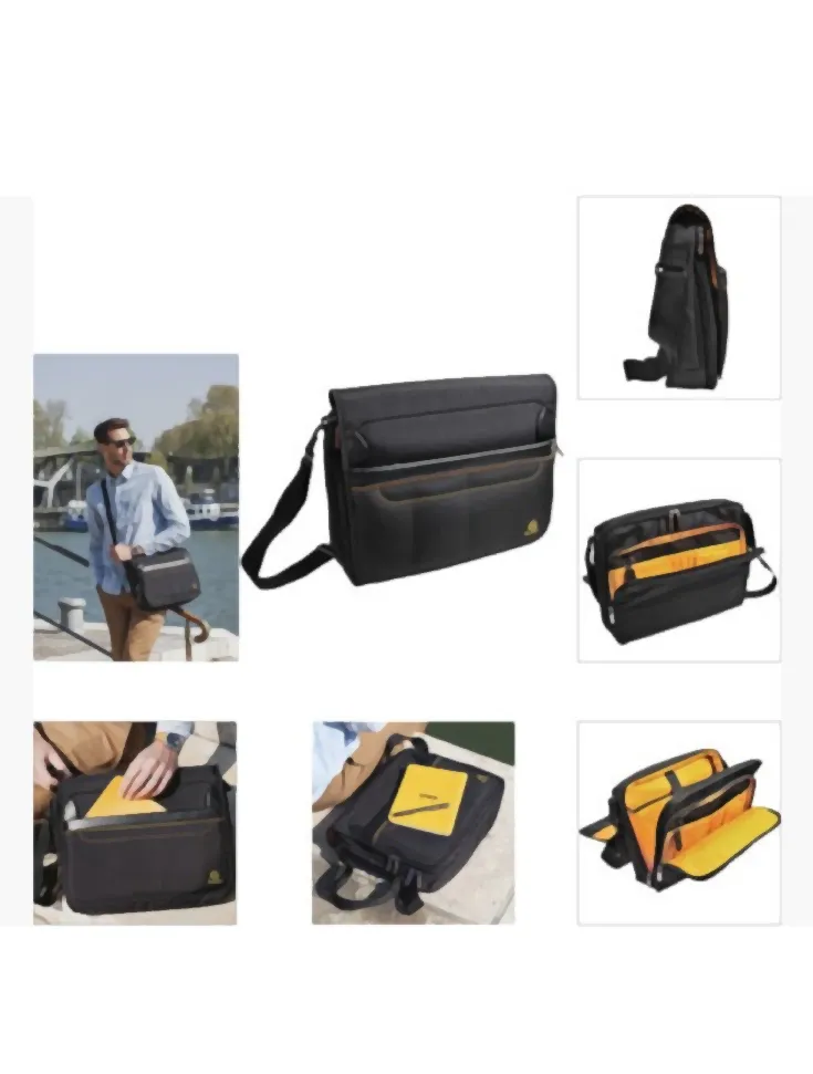 Messenger bag for laptop and tablets up to 14''. Convenient magnetic closure. The main compartment has a padded pocket to protect the laptop or tablet. The front compartment has several pockets for business essentials: phone, pens... And the additional zipped pockets on the front and on each side are very convenient to keep important things within reach. Smart sleeve to stabilize the messenger bag on top of a suitcase.