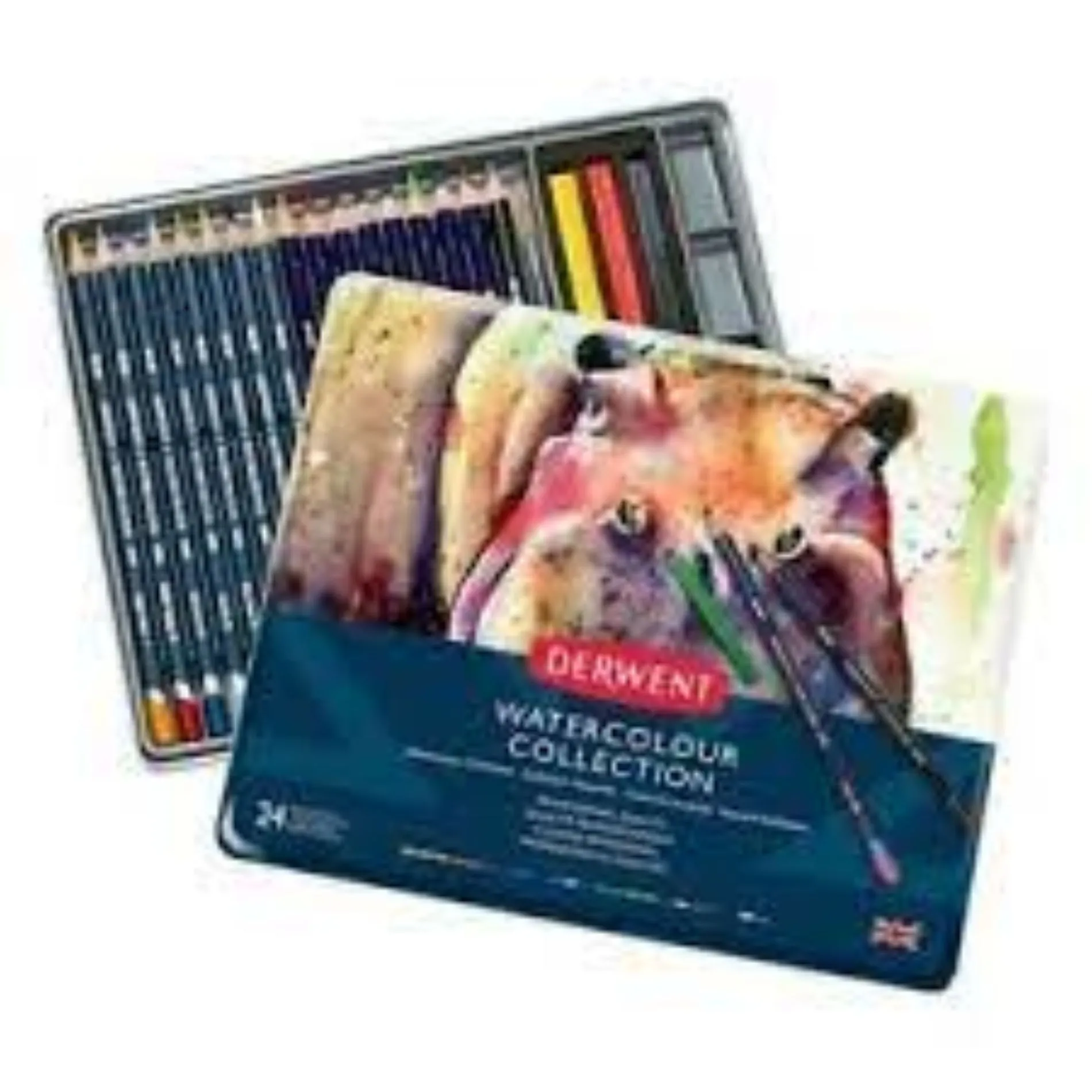 "Derwent Watercolor Collection, 24-Ct. Metal Tin A Versatile Mix of Watercolor Media. Watercolor media offers an exciting way to create. And, the Derwent Watercolor Collection includes the inspirational materials that can help any level of artist obtain a working knowledge of how watercolors work. Aquatone Pencils provide pure, concentrated color that can be applied to paper using wet or dry techniques."